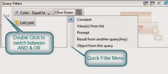 Static Filters: Doesn't need any interaction from the end user. the criteria or filter values are impeded inside the filter and will submitted directly to the database. Static filter is either created in the universe and you can just drag and use them. They will appears like a yellow cone. You can also create your own static filters by dragging an object and set you filter values to constant or select from list of values. Again, when you refresh data fro your report it will not ask the end user to enter any values as the filter values already defined.
